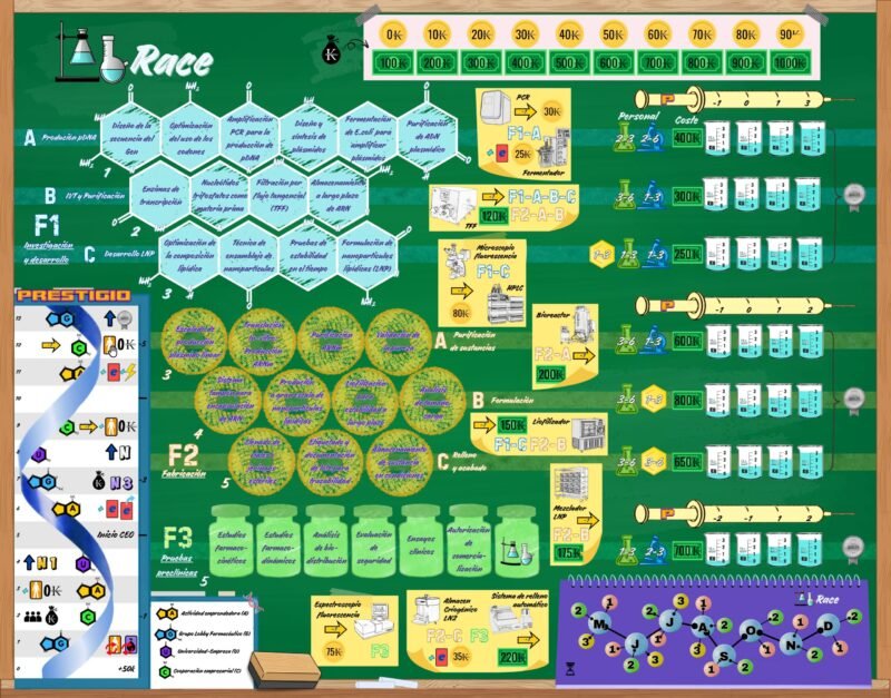Este juego de mesa es perfecto para las noches en familia o para reuniones con amigos. Atraerá tanto a los veteranos de los juegos de estrategia como a aquellos que están dando sus primeros pasos en este mundo. Lab Race es accesible para todos, creando horas de diversión a medida que tu laboratorio lucha por convertirse en el vacunador principal y ganar el verdadero desafío: ¡salvar al mundo en tiempo récord!